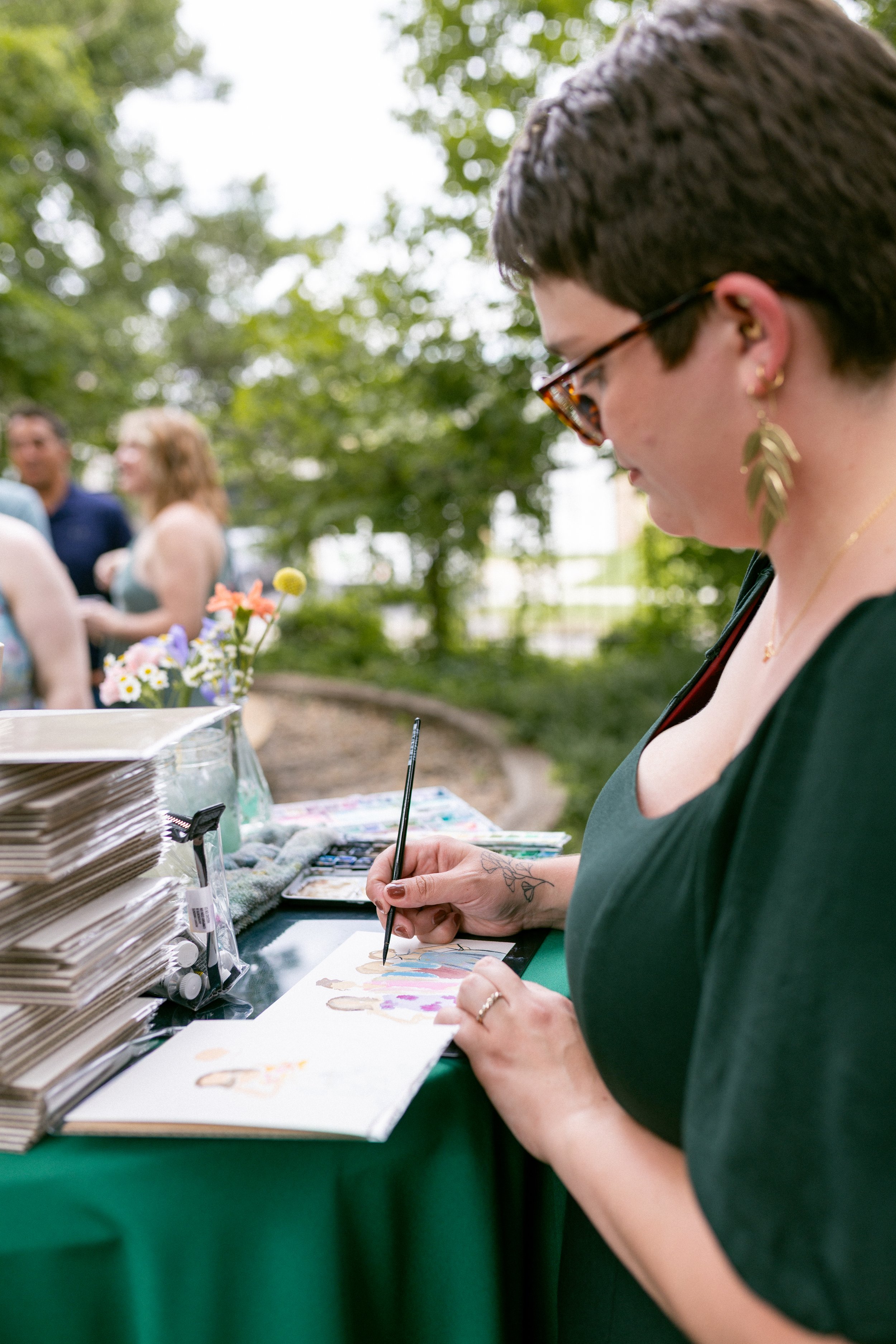 Using color, light, and expressive brushstrokes, my impressionist style paintings and fashion sketch inspired guest portraits seek to capture the personality of the subject rather than a photorealistic rendering. I paint in a lively, fast paced process that brings out the dynamic fluidity that only watercolor can bring.
